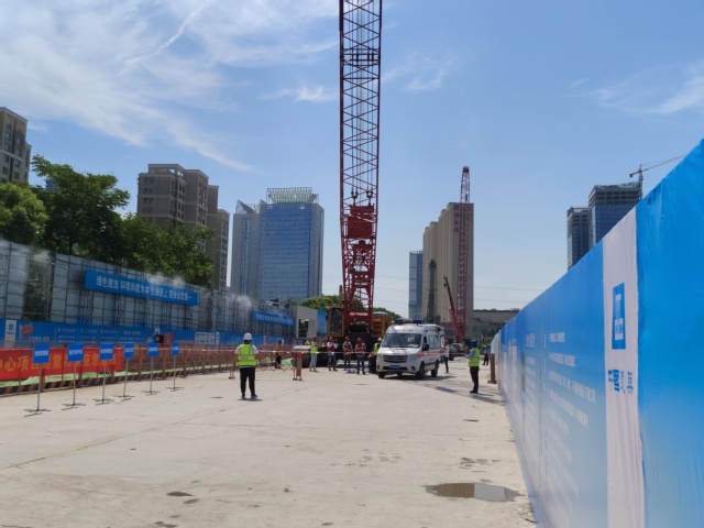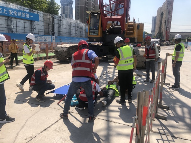 本次应急演练活动模拟施工现场履带式起重机在作业过程中由于钢丝绳断裂,吊物从高处掉落倒下,不幸将地面一名作业人员脚部砸伤的事故。现场专职安全员发现后第一时间向应急救援指挥部汇报,应急救援指挥部立即启动应急预案,各应急救援小组接到救援命令后,迅速跑向事故地点,对受伤人员开展救援工作,同时拉起警戒线,保护现场。救援人员按预案分工,有条不紊地实施清障、包扎、伤员担架固定、运送上救护车等一系列动作。本次演练活动,增强了员工的安全操作意识,提高了快速反应能力、应急救援能力以及协同作战能力。