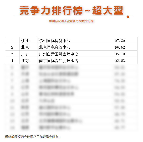 本届榜单按照酒店的规模体量分为超大型、大型、中型、小型四个类别,从上一年度承接会议数量和规模、会议室容量和数量、客房总数、渠道客评、经营数据等多方面进行综合评价,经数据调研、专家评审等多个环节细致评估,得到了相对客观准确的评选结果。国青酒店凭借自身场地优势、对会议客户市场的探索及挖掘、专业的会议接待服务,赢得了专家评委及企业买家的认可,在榜单中以总分92.83的好成绩位列全国第四。