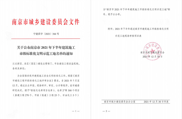 bevictor伟德金融中心项目开工建设至今已整整一年。在这一年里,项目部克服多重困难,科学有效组织施工单位开展工程作业,在施工现场洞口、临边、通道、防护棚等均采用标准定型化安全防护设施,现场做到先防护后施工,同时施工围挡及挖掘机上安装喷淋系统并配备自动防尘雾炮机,施工现场铺盖六针绿网防尘等。开工至今,项目施工现场未发生任何安全事故,并获得了南京市差别化管理工地称号,受到南京市建邺区扬尘办红榜通报表扬2次、南京市攻坚办红榜通报表扬1次。