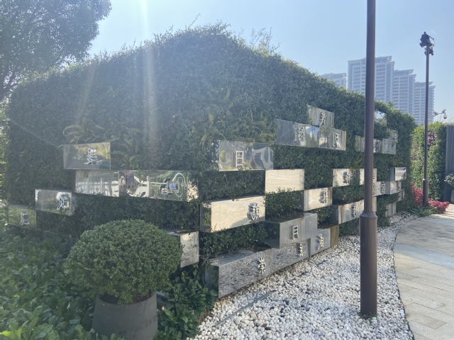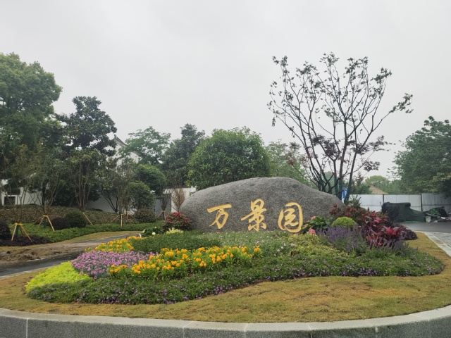 万景园北入口项目将原始花坛改造成弧形整石花坛,常夏石竹、八仙花、女贞球等彩叶花灌木铺满在景观石的四周,形成植物品种丰富、层次分明的小型花境。入口处增设标有“万景园”字样高达12米的立牌,高大醒目,与鱼嘴公园、青年文化公园、绿博园形成了统一的滨江风光带入口标识。