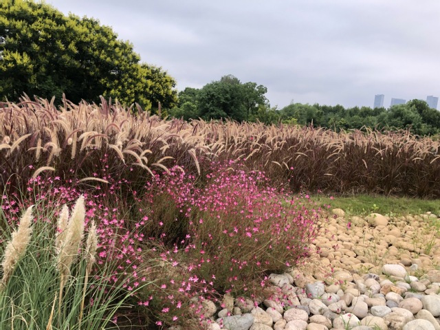 紫金文创园屋顶花园提升项目将植物配置进行全面提档升级,把原有枯黄退化、高低不平的狗牙根草地进行翻新整地,栽植了薄雪万年草,红叶景天,粉黛乱子草、紫穗狼尾草等灌木和草本植物,既保证了屋顶承重的要求,又形成了野趣的屋顶景观效果。