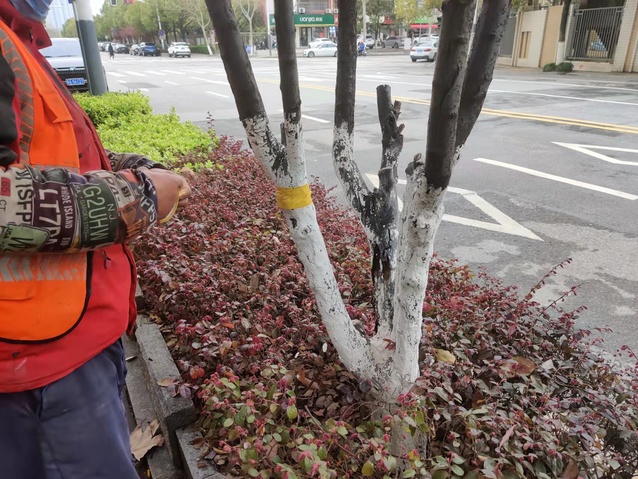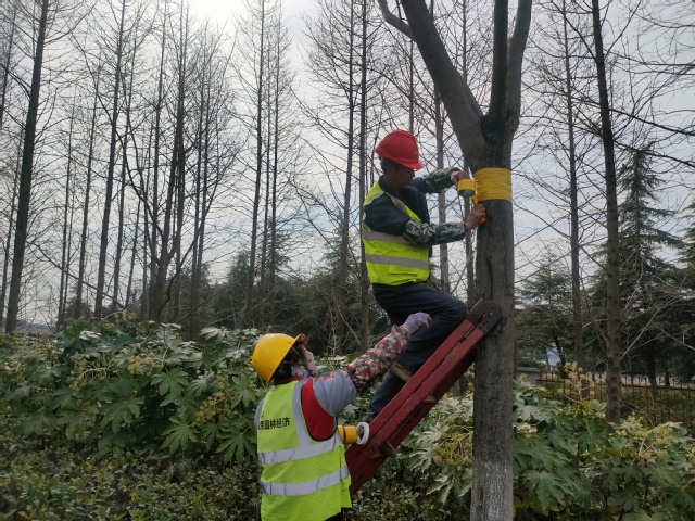 这项举措不仅可以大大降低绿化养护成本,并且还不存在农药残留,不污染环境。目前公司绿化养护人员已经对啬园路83株栾树、苍山路的20余株紫叶李进行了胶带黏虫实验,后期公司将持续进行观察,来检验其防治效果,为后期开展病虫害防治提供宝贵的科学依据。