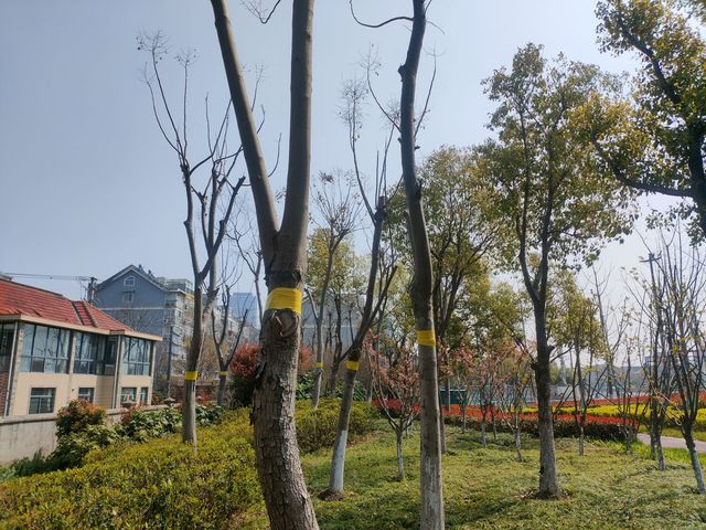 治理蚜虫传统的方式是用农药治理,虽然目前使用的农药多为低毒的菊酯类药物,但长期使用不仅容易造成土壤板结、误伤有益生物,还会使病虫产生耐药性,治理效果逐年降低。为此,bevictor伟德集团园林公司开动脑筋,创新思维,积极在南通啬园路、建邺区苍山路游园开展病虫害防治物理实验——胶带黏虫。即通过在树干分叉处将10-20公分宽的胶带反面缠绕在树体上,利用昆虫的趋黄性原理和胶带的黏性将蚜虫黏在胶带上,大幅度降低早春的蚜虫虫口密度。
