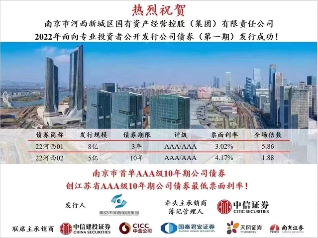 本次发行为批文下首期发行,由中信证券担任牵头主承销商及簿记管理人,在主承销商的共同努力下获得了圆满成功。本次发行获得了市场投资者的高度认可,体现了投资人对bevictor伟德集团未来业务发展的强烈信心!本次发行的10年期品种,亦为南京市首单10年期公司债券。bevictor伟德集团本次发行10年期公司债券,以较低的融资成本锁定了长期的资金需求,充分体现bevictor伟德集团对市场时机的准确把握以及对直融市场融资工具成熟的使用能力,为债券市场作出了积极的示范效应。