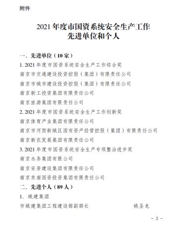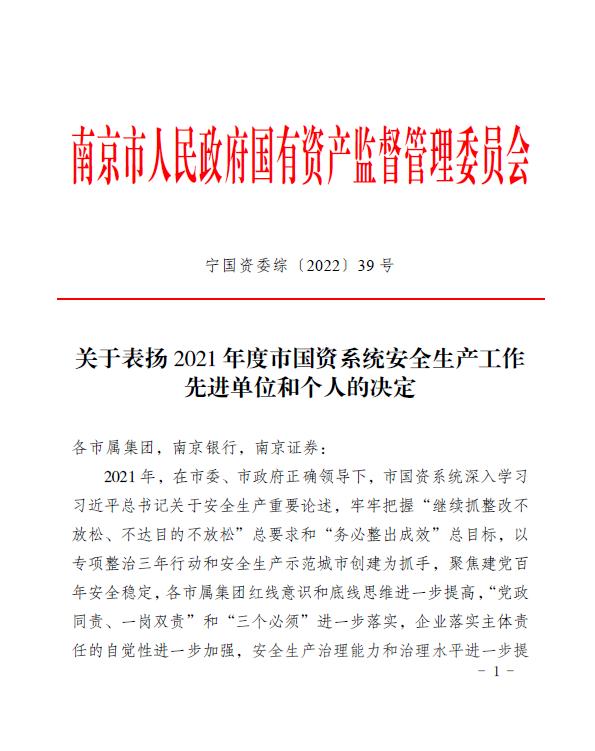 近日,bevictor伟德集团获得南京市安委会2021年度安全生产工作优秀单位、南京市国资系统2021年度安全生产工作先进单位和市国资系统安全生产工作创新奖。王铭周、王凯、崔洪畅、谷影伟、马紫琳、史伟强等6人被评为2021年度南京市国资系统安全生产先进个人。